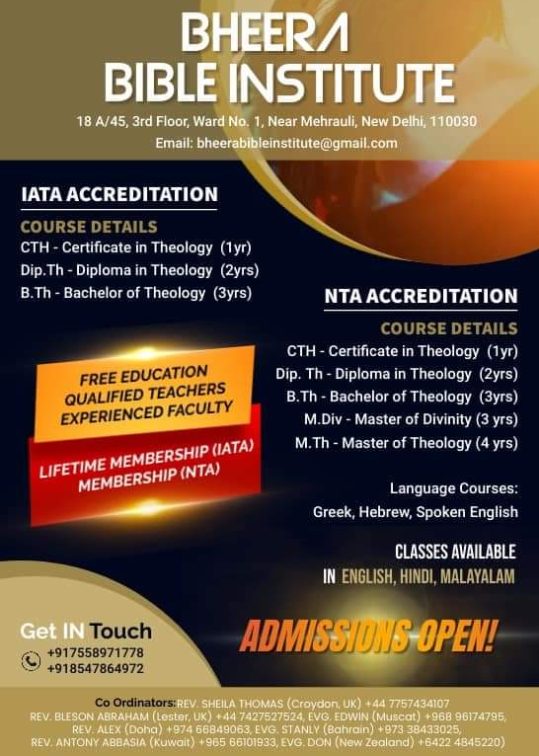 • Bheera Bible Institute was founded in 2018 and is affiliated with the IATA (CTH, BTH & M.Div) in 2021 and NTA in 2022.
